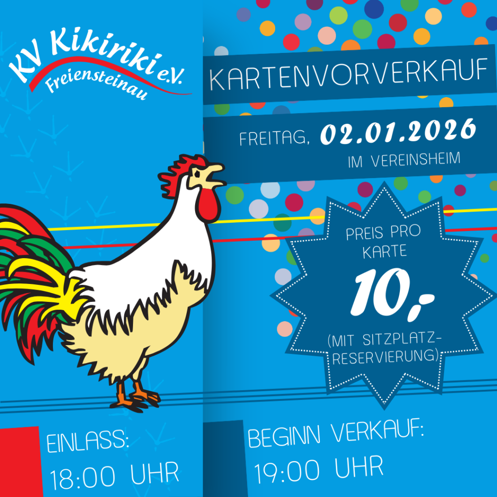 An unserem Kartenvorverkauf könnt ihr Karten für die 1. und 2. Sitzung – unsere Abendsitzungen erwerben. Die Kosten pro Karte belaufen sich auf 10 €. Der Einlass ins Vereinsheim startet um 18 Uhr und ab 19 Uhr beginnt der Verkauf. Wir freuen uns euch zu sehen.